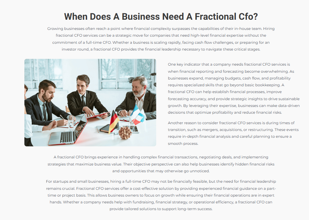 • Established Enterprises: Mature businesses can leverage fractional CFO services to optimize processes, enhance profitability, and implement advanced strategies.